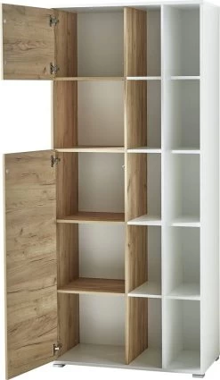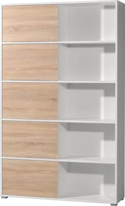 Das schmale, weiße Aktenregal besitzt 2 Regalfächer in Ordnerhöhe, bzw. -tiefe.