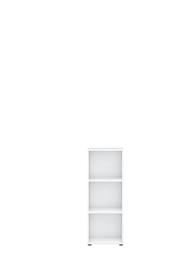 Das schmale, weiße Aktenregal besitzt drei Regalfächer in Ordnerhöhe, bzw. -tiefe.