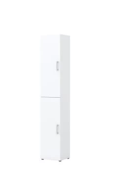 Der schmale Aktenschrank hat 2 Türen mit 6 dahinter liegenden Regalfächern in Ordnerhöhe, bzw. -tiefe.