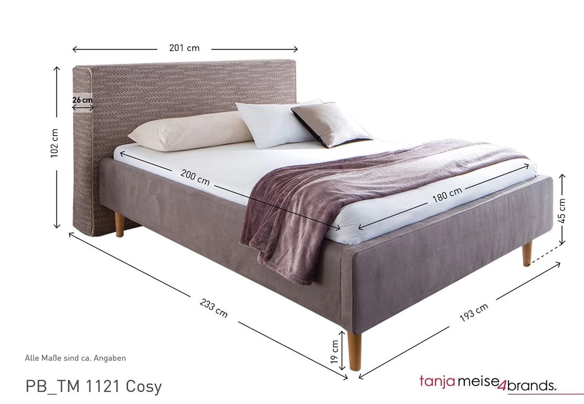 Das Polsterbett Cosy in Designer-Optik besticht durch stabiler Bettumrandung und das Kopfteil mit standhafter, gerader Haltung durch Einhängung in vormontierte Beschläge.