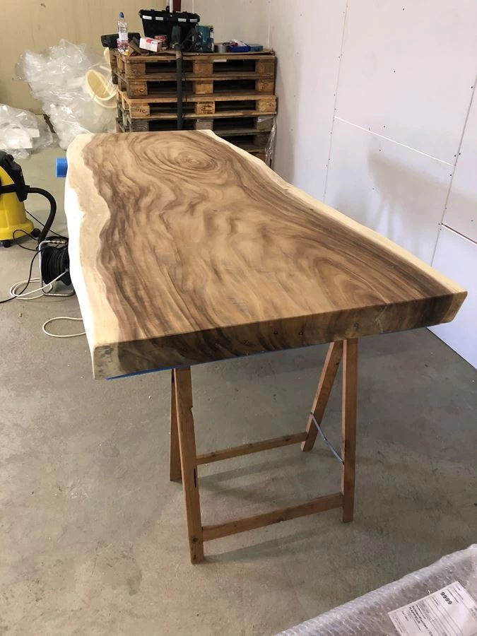 Die unbehandelte Tischplatte hat eine Stärke von ca. 8-9cm.