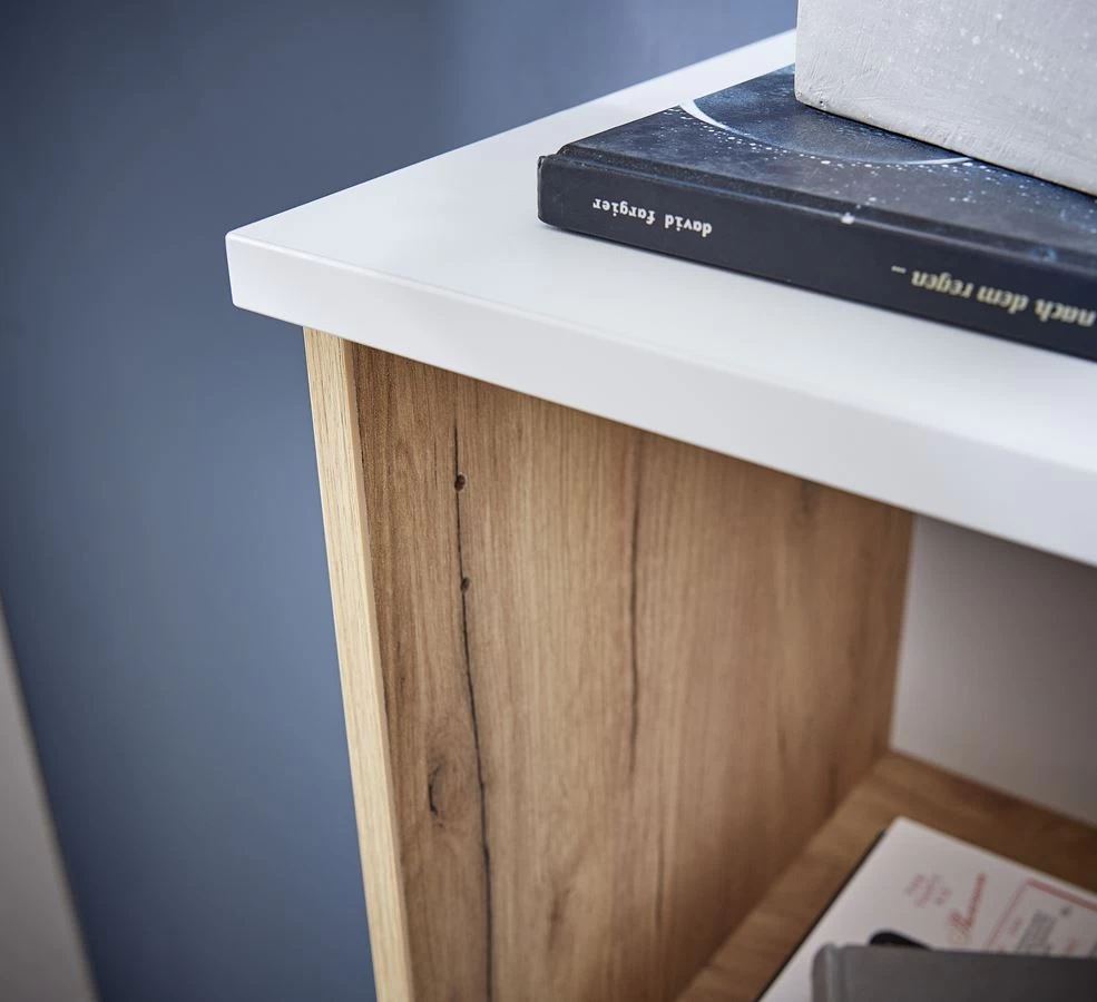 Im Design ist alles in einem klassischen Weiß mit spannenden Akzenten in Navarra-Eiche-Nb. gehalten. Dadurch schafft Leo nicht nur Stauraum, sondern wertet Ihr Arbeitszimmer auch gekonnt auf. Aufgrund seiner Ausführung und Farbgebung ist der Aktenschrank aus der Serie perfekt für die Vervollständigung Ihres Bürobestandes. Er passt zu vielen Stilen und lässt sich somit nahtlos ins bereits vorhandene Büro integrieren. Vor allem in Ihrem heimischen Arbeitszimmer bietet der Aktenschrank in puncto Platz und Ordnung eine optimale Lösung, denn die sieben offenen und zwei geschlossenen Fächer hinter einer Tür bieten genügend Stauraum für Aktenordner, Bücher und andere Arbeitsmaterialien, ohne dass das Büro überfüllt und vollgestopft wirkt.