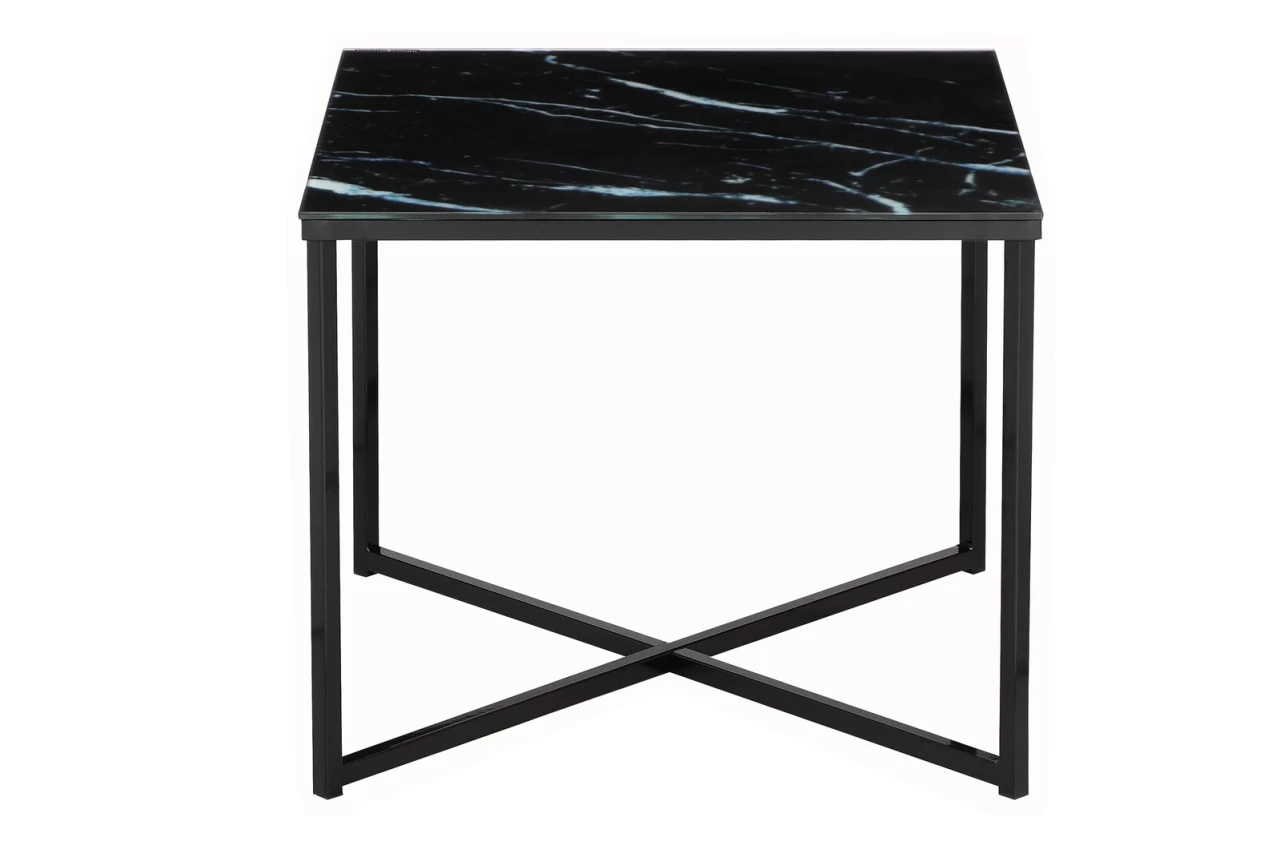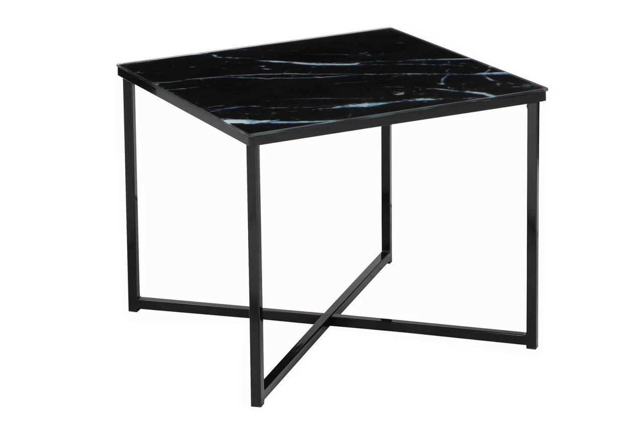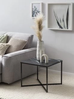 Der quadratische Beistelltisch vereint modernes Design mit einer Portion Extravaganz. Die Glasplatte mit unterliegender Folie in Marmoroptik passt perfekt zu dem schwarzen Gestell aus Metall. Der Sofatisch bietet genügend Ablagemöglichkeiten für z.B. Zeitschriften, eine Blumenvase oder schöne Leuchte. Durch sein attraktives Design und die quadratische Form ist dieses Tischlein mit vielen Möbeln kombinierbar und findet auch in Ihrem Zuhause ein geeignetes Plätzchen.