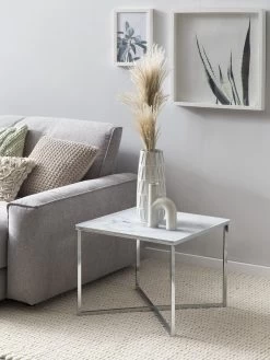 Der quadratische Beistelltisch vereint modernes Design mit einer Portion Extravaganz. Die Glasplatte mit unterliegender Folie in Marmoroptik passt perfekt zu dem Metallgestell in Chrom. Der Sofatisch bietet genügend Ablagemöglichkeiten für z.B. Zeitschriften, eine Blumenvase oder schöne Leuchte. Durch sein attraktives Design und die quadratische Form ist dieses Tischlein mit vielen Möbeln kombinierbar und findet auch in Ihrem Zuhause ein geeignetes Plätzchen.