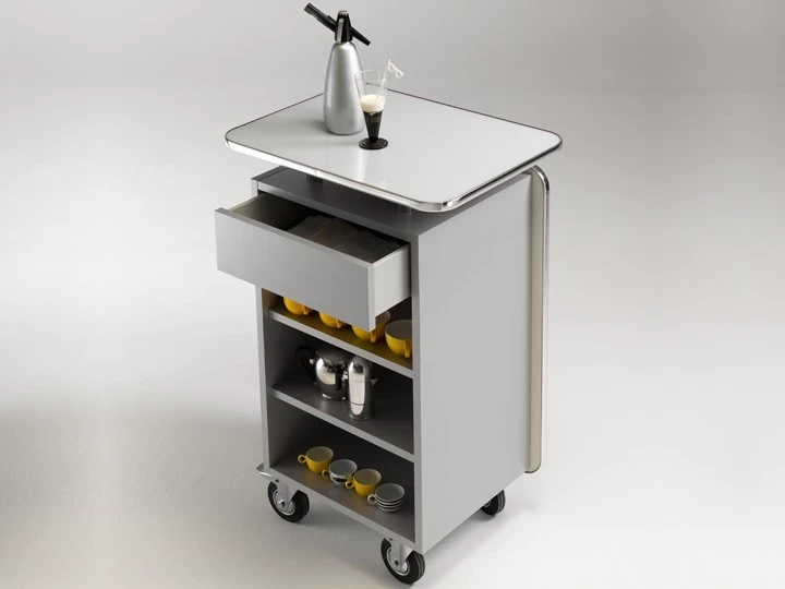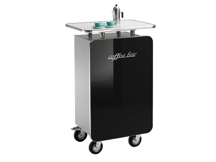 Die Theke Coffee Bar heißt Ihre Gäste herzlich willkommen und bietet zur Begrüßung eine ultra hochglänzend lackierte Front aus MDF. Den gleichnamigen Schriftzug können Sie bei Gefallen selbst aufkleben. Berührung scheut die Arbeitsplatte aus Milchglas nicht, denn sie ist mit einer glanzverchromten Schutzkante umrahmt. Der Korpus aus melaminbeschichteter Spanplatte ist silberfarben lackiert. Reichlich Stauraum bietet das Innenleben mit höhenverstellbaren Fachböden. Lenkrollen, zwei davon mit Feststellbremse, bringt die elegante Theke samt Espresso und Co. an jeden gewünschten Ort. Der kleine Schwarze kommt heiß serviert zu Ihren Gästen „coffee to go“ war gestern.