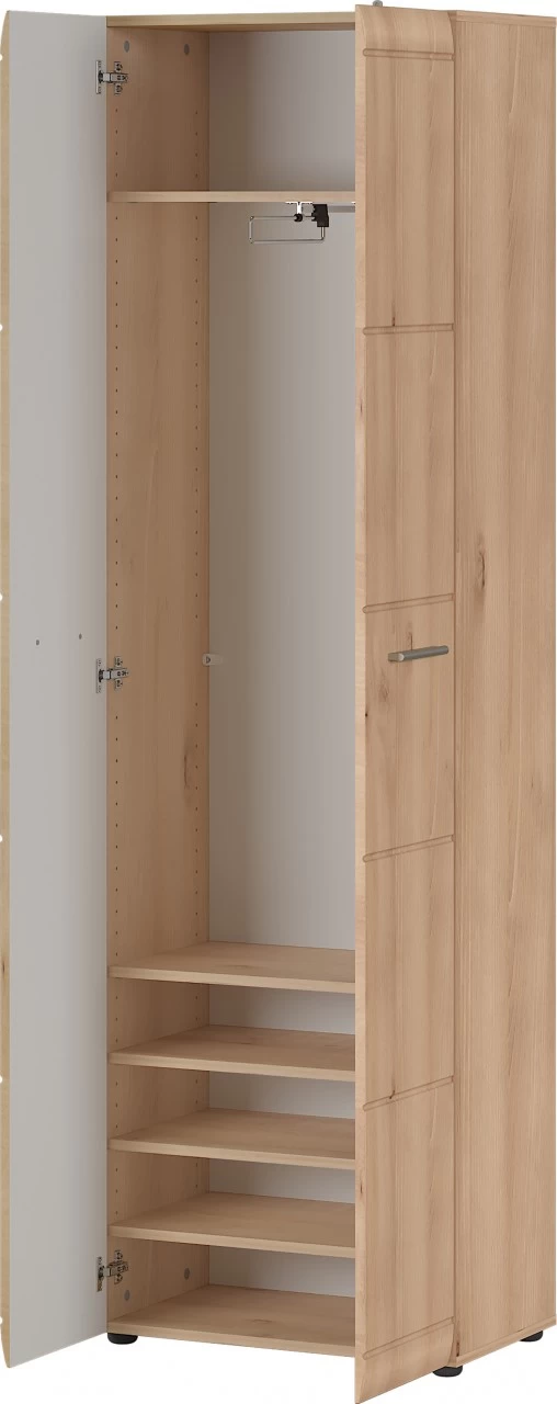Der Garderobenschrank von Livingruhm mit 2 Türen, dahinter ein fester und vier verstellbare Einlegeböden. Zusätzlich besitz die Garderobe eine auziehbare Kleiderstange aus Metall.