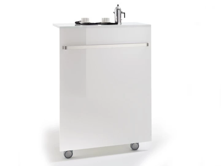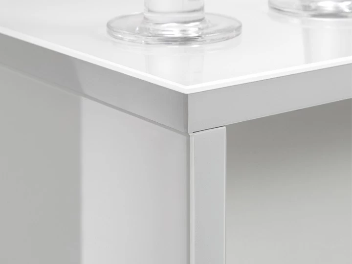 Diese Theke ist in den Farben Schwarz und Weiß erhältlich. Die Front sowie die Deckplatte der Theke sind aus Spezial-Verbundglas gefertigt, die Kanten sind poliert.
