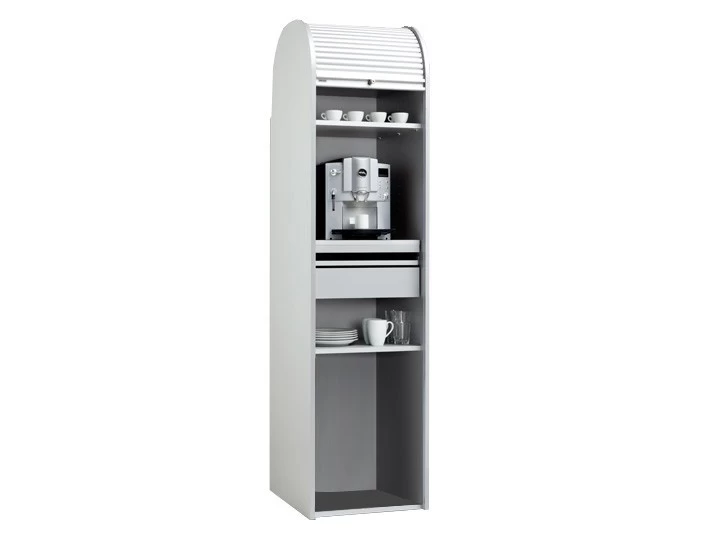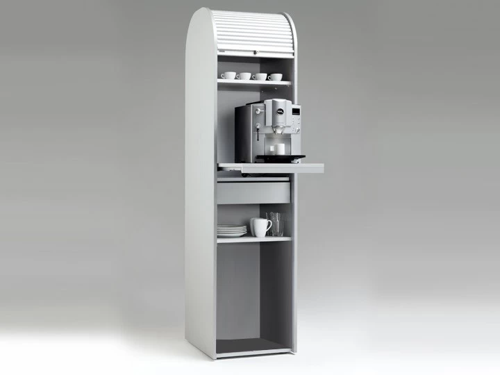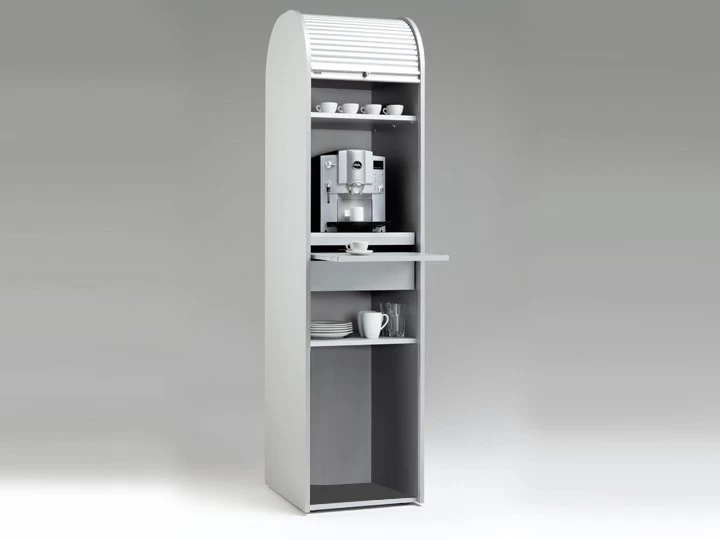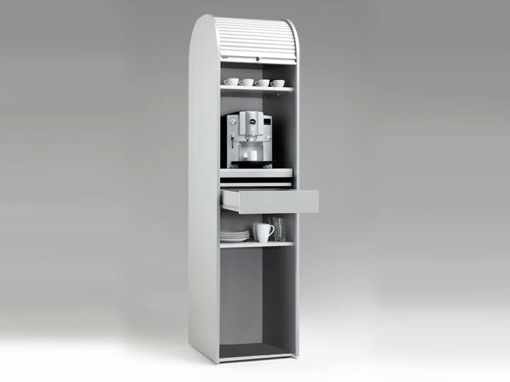 Der Kaffeeschrank von Klenk/MS-Schuon genießt schon lange Kultstatus. Profi Qualität in Kombination mit zeitlosem Design sind die Gründe dafür. Hinter den Rollladen findet sich alles, was man für eine gelungene Kaffeepause benötigt: Ein Ausziehboden für Kaffeemaschinen mit der Breite von 45 cm und einer Tiefe von 51 cm und ein Ausziehtablar als Ablagefläche. Ein fixierter Zwischenboden sowie ein höhenverstellbar Fachboden sorgen für genügend Stauraum. DANCER räumt auf in Küche oder Büro. Entgegen zu den passenden Hochschränken ist der Kaffeeschrank nicht als Raumteiler nutzbar