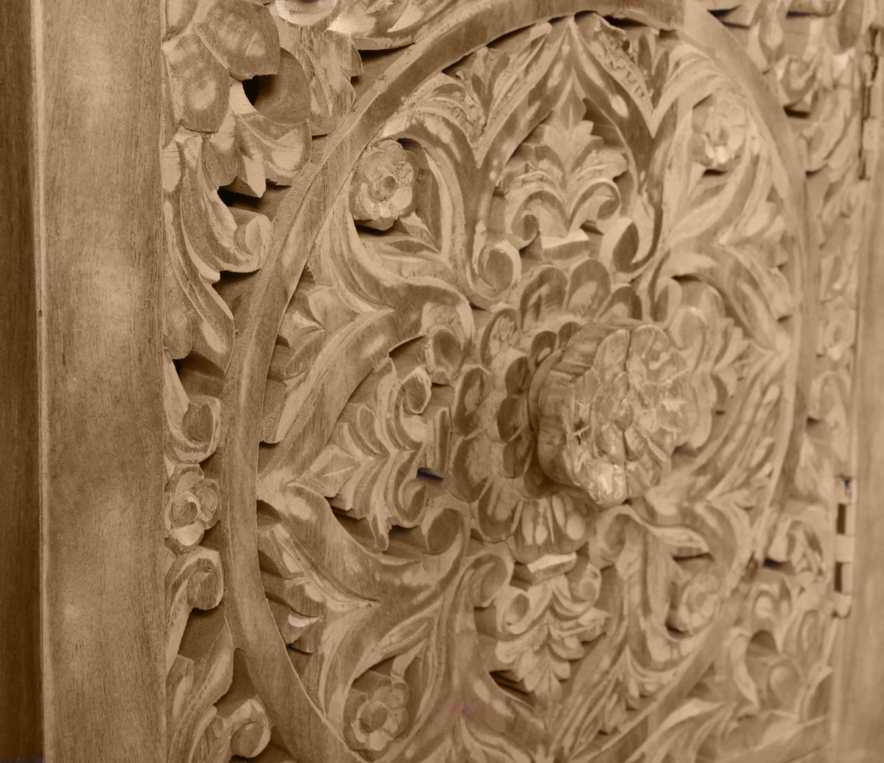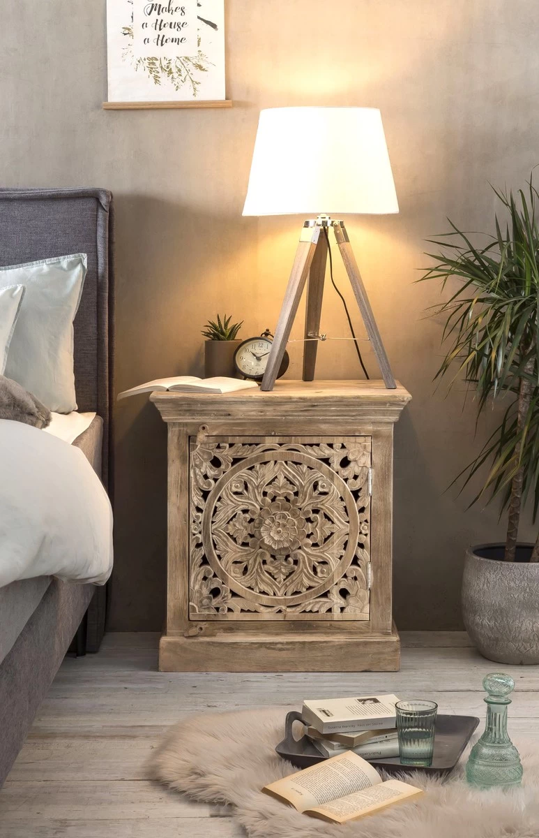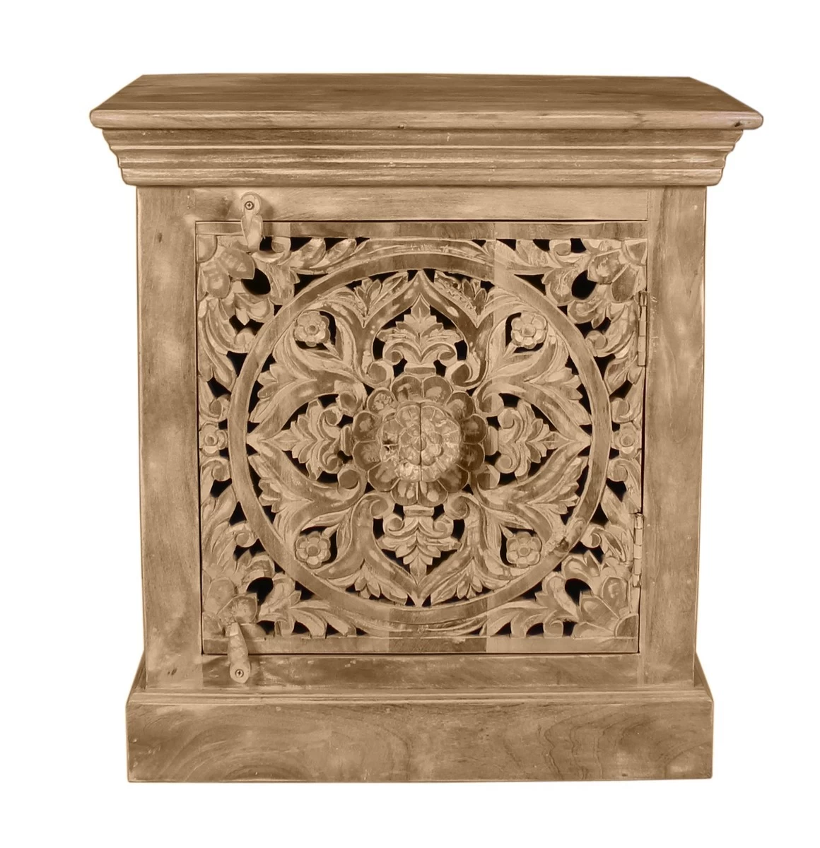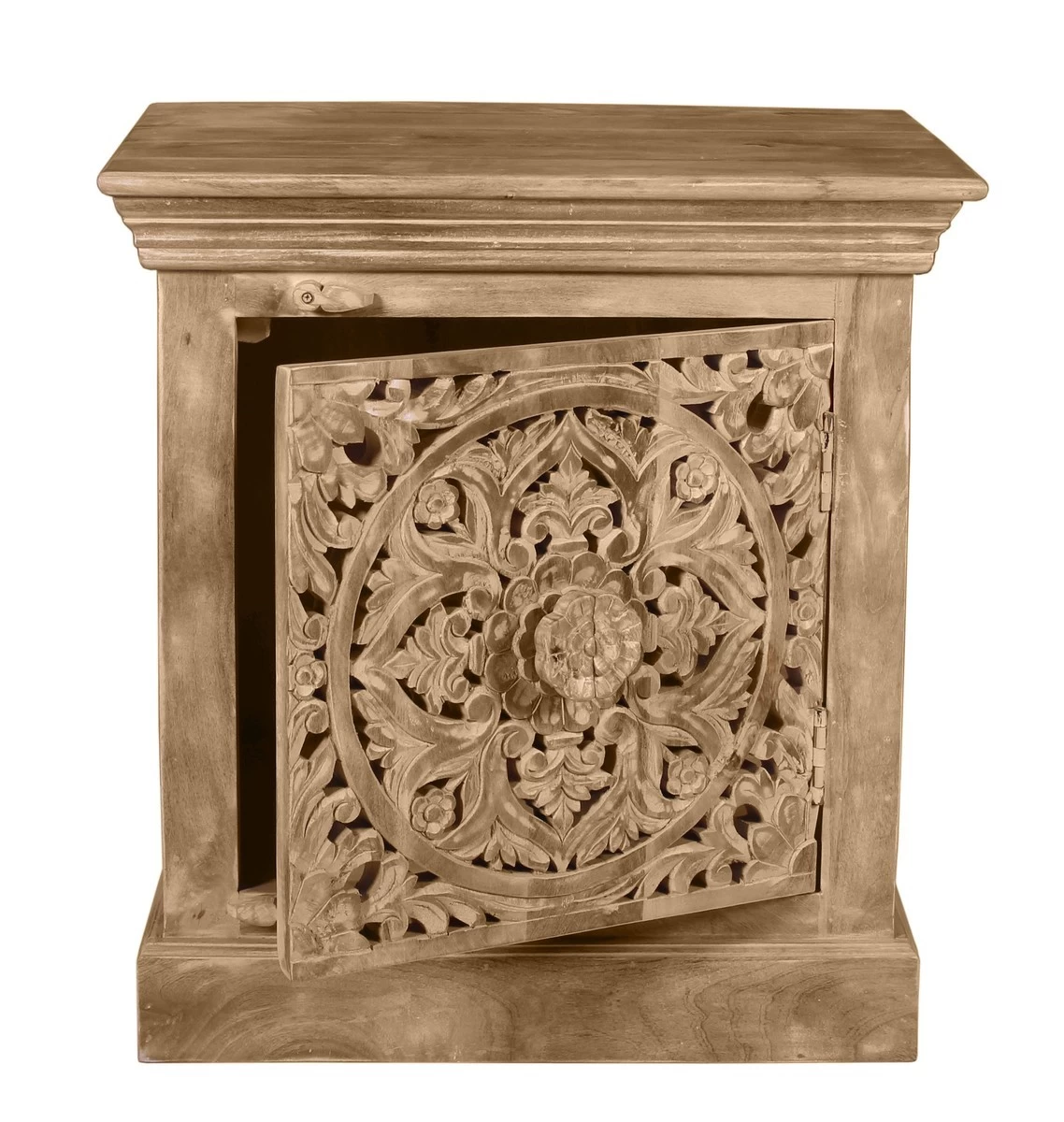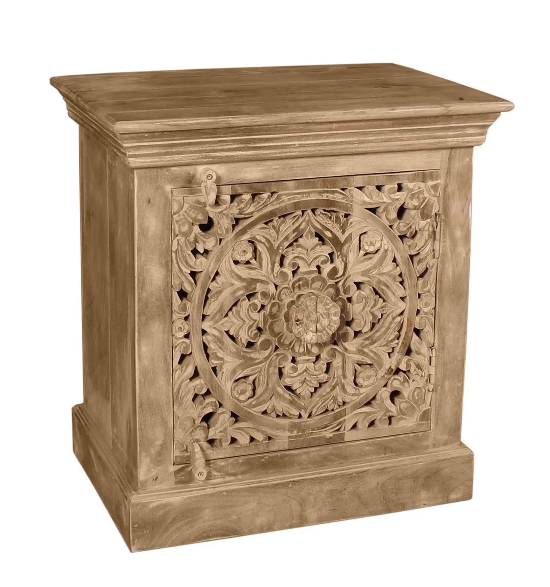 Dieser Nachtschrank aus Mangoholz in einem hellen Naturton wertet Ihre Räumlichkeiten auf. Hinter der Tür bietet sich genügend Stauraum für vielerlei Dinge. Auf der Deckplatte finden Nachttischlampe, Wecker und Co. ihren Platz. Die kleine Kommode lässt sich auch prima als Einzelstück in weiteren Wohnräumen aufstellen. Die aufwändigen Schnitzereien an der Front machen dieses Schränkchen zu einem absoluten Hingucker, um den Ihre Freunde sie beneiden werden. Jedes Teil ist ein Einzelstück von Wert.