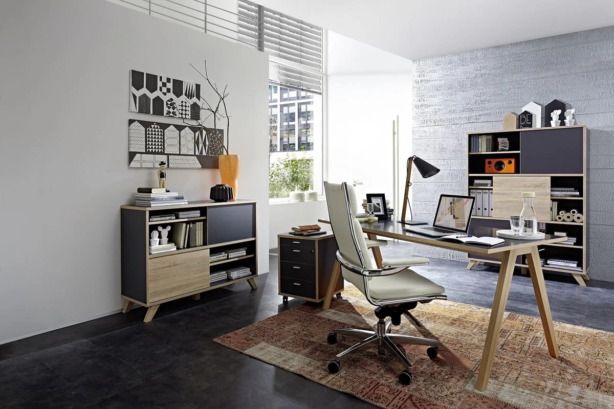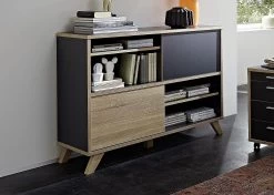 Das Büroprogramm von Livingruhm ist mit seinem dunklen Dekor in Anthrazit und den auffälligen Absetzungen in Eiche-Nb. die moderne Interpretation des beliebten skandinavischen Einrichtungsstils. Dabei geben Ihnen alle Schiebetürregale aus der Serie die Möglichkeit, den Stauraum in Ihrem Büro individuell zu gestalten.