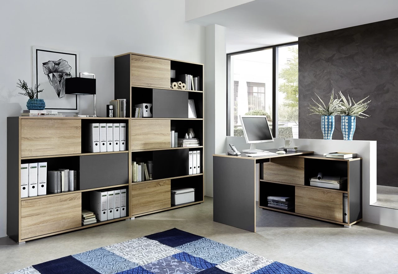 Dieses Büromöbelprogramm von Livingruhm vereint Eleganz mit natürlicher Optik. Die perfekte Stauraumlösung für jedes Büro oder Ihren Homeoffice Arbeitsplatz. Die Serie passt sich an, egal ob verstellbare Einlegeböden oder auch die Möglichkeit, Farben zu wählen. Das Resultat kann sich sehen lassen, egal ob in der Studentenbude, für den Manager Arbeitsplatz oder auch einfach im Wohnzimmer. Wohnambiente und Funktionalität bilden hier eine perfekte Einheit.