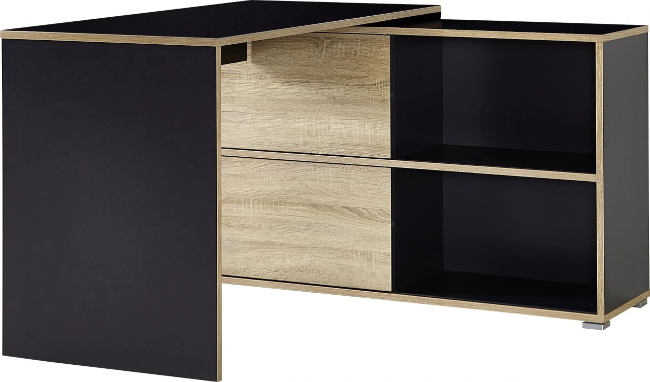 Der Winkelschreibtisch mit Seitenwange und intergrietem Sideboard. Das Sideboard besteht aus 4 Fächern, mit 2 Schiebetüren.