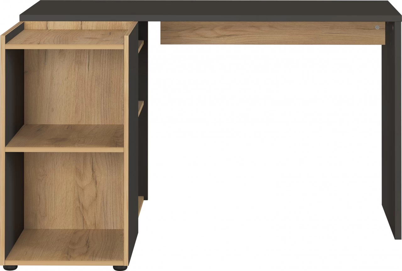 Der Winkelschreibtisch von Livingruhm mit intergrietem Sideboard. Das Sideboard besteht aus 5 offenen Fächern.