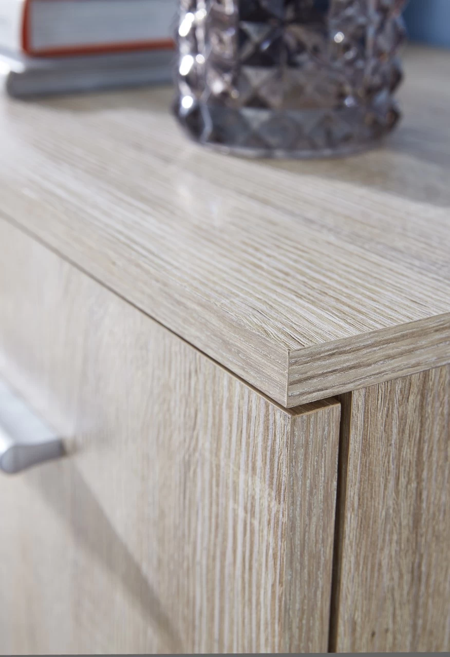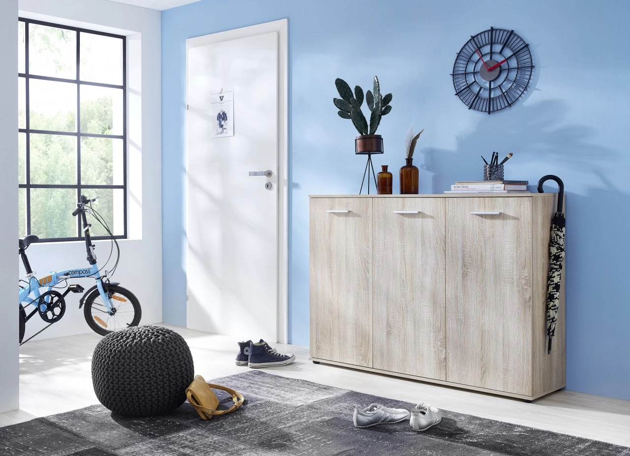 Die Livingruhm Garderobe sticht mit einer gemütlichen Holzoptik, die Ihre Gäste und die Familie im Eingangsbereich empfängt, bietet das Garderobenprogramm. Klare Formen und dezente Kantengriffe aus Metall mit Feinperlstruktur unterstreichen die einladende Optik. Viel Platz für Schuhe, Accessoires und Kleidung bieten Schuhschrank, -bank, Garderobenschrank und Paneel.