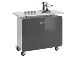 Die Theke Cool heißt Ihre Gäste herzlich willkommen und bietet zur Begrüßung eine ultra hochglänzend lackierte Front aus MDF. Den gleichnamigen Schriftzug können Sie bei Gefallen selbst aufkleben. Berührung scheut die Arbeitsplatte aus Milchglas nicht, denn sie ist mit einer glanzverchromten Schutzkante umrahmt. Der Korpus aus melaminbeschichteter Spanplatte ist silberfarben lackiert. Reichlich Stauraum bietet das Innenleben mit höhenverstellbaren Fachböden. Lenkrollen, zwei davon mit Feststellbremse, bringt die elegante Theke samt Espresso und Co. an jeden gewünschten Ort. Der kleine Schwarze kommt heiß serviert zu Ihren Gästen „coffee to go“ war gestern.