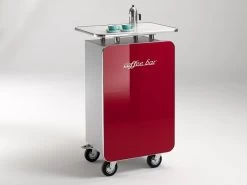 Die Theke Coffee Bar heißt Ihre Gäste herzlich willkommen und bietet zur Begrüßung eine ultra hochglänzend lackierte Front aus MDF. Den gleichnamigen Schriftzug können Sie bei Gefallen selbst aufkleben. Berührung scheut die Arbeitsplatte aus Milchglas nicht, denn sie ist mit einer glanzverchromten Schutzkante umrahmt. Der Korpus aus melaminbeschichteter Spanplatte ist silberfarben lackiert. Reichlich Stauraum bietet das Innenleben mit höhenverstellbaren Fachböden. Lenkrollen, zwei davon mit Feststellbremse, bringt die elegante Theke samt Espresso und Co. an jeden gewünschten Ort. Der kleine Schwarze kommt heiß serviert zu Ihren Gästen „coffee to go“ war gestern.