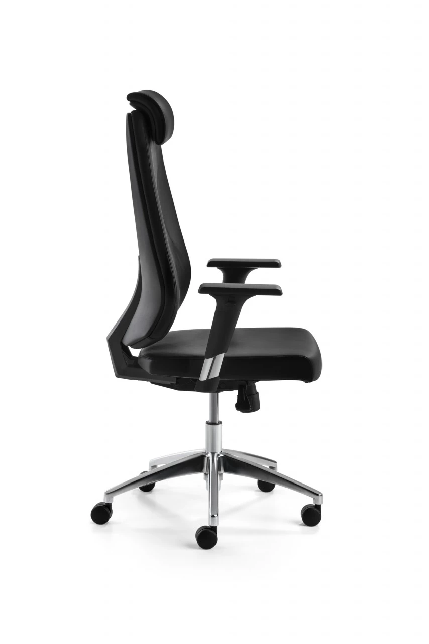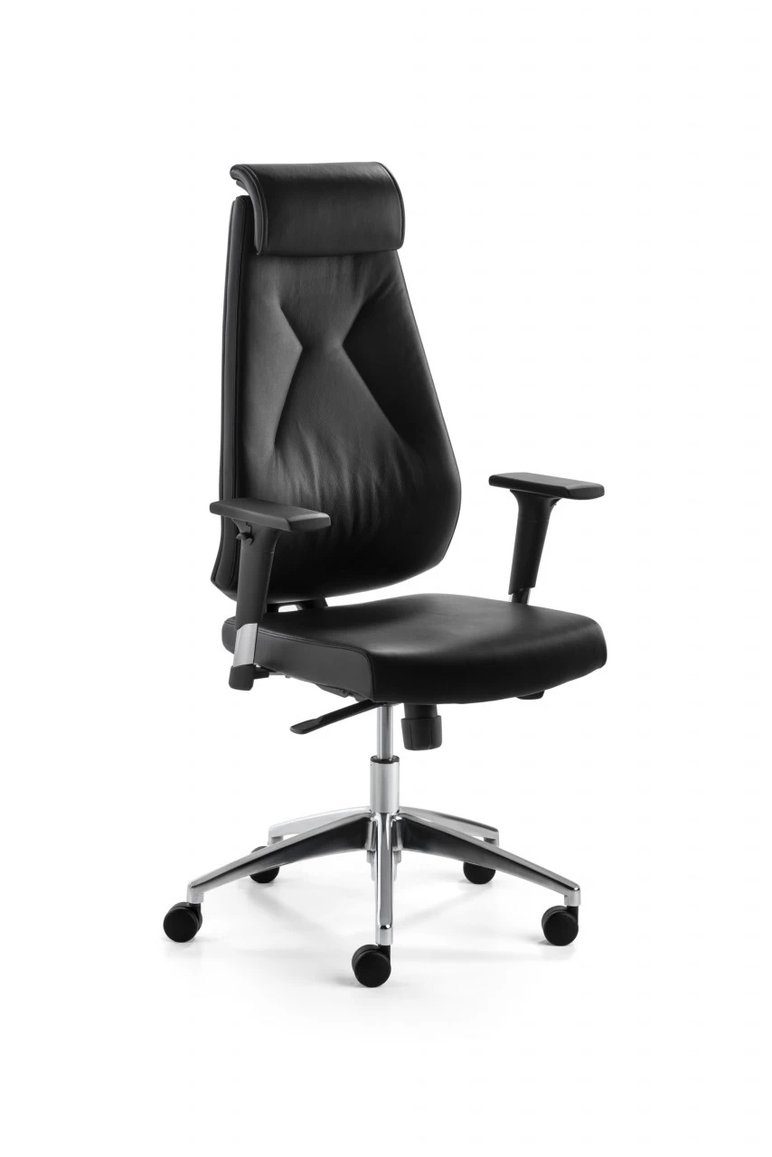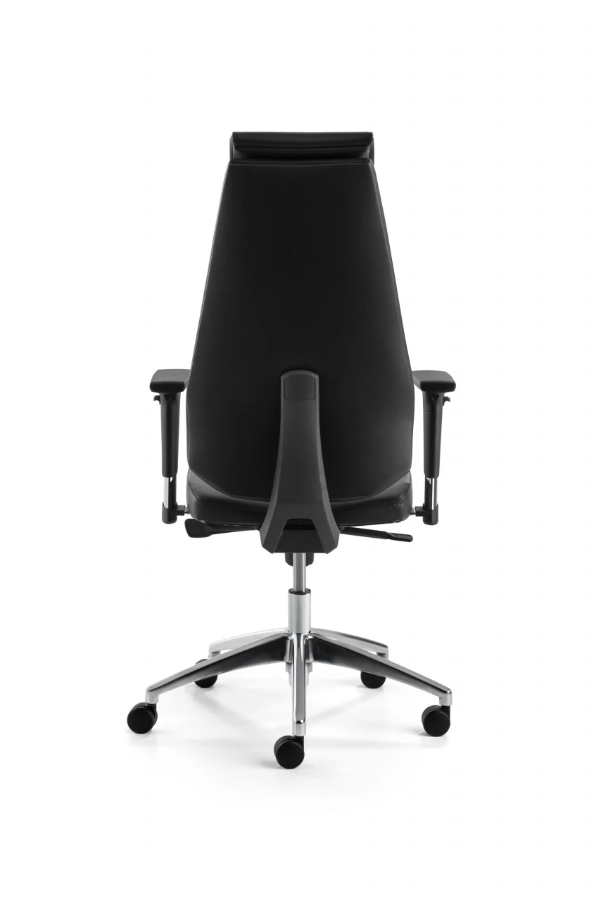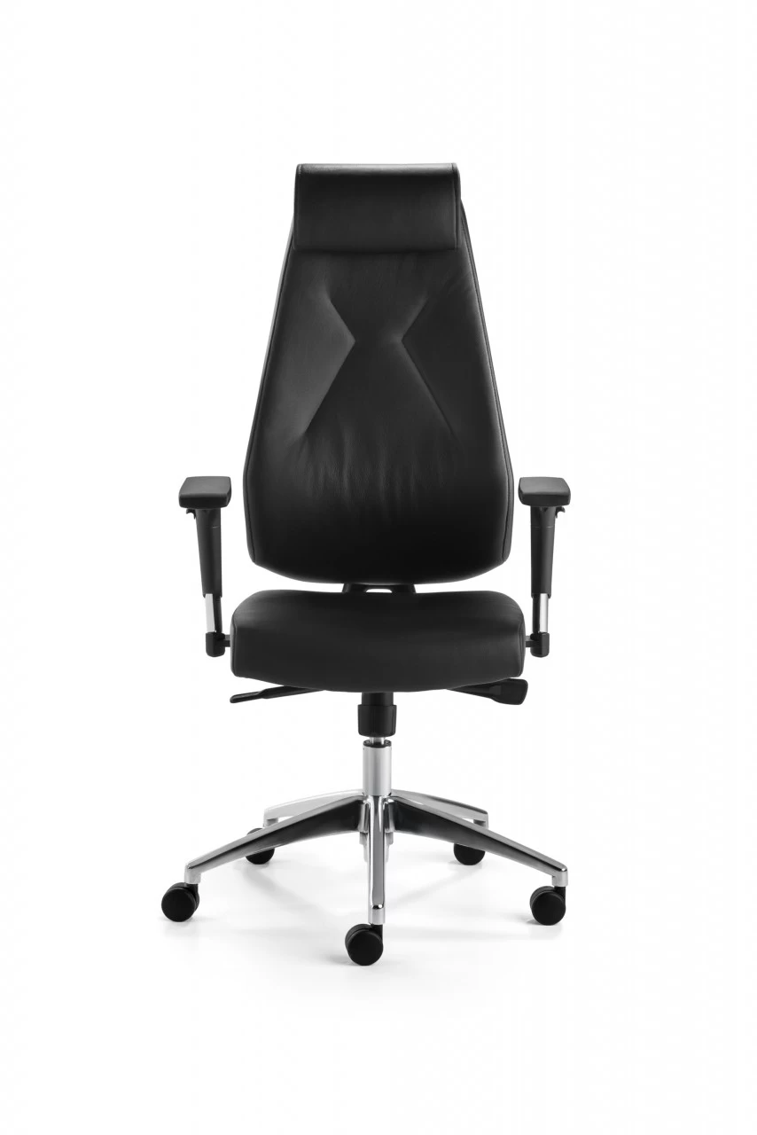 Vorderseite Echtleder Schwarz, Armlehnen höhenverstellbar, Synchronmechanik mit individueller Gewichtseinstellung, TÜV geprüft, Alu-Fußkreuz poliert, inkl. große Rollen für Teppichböden