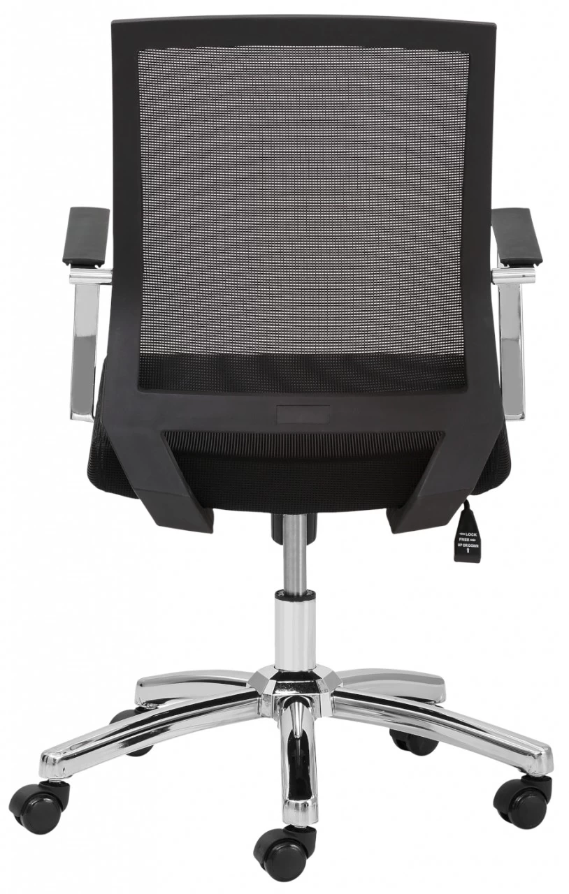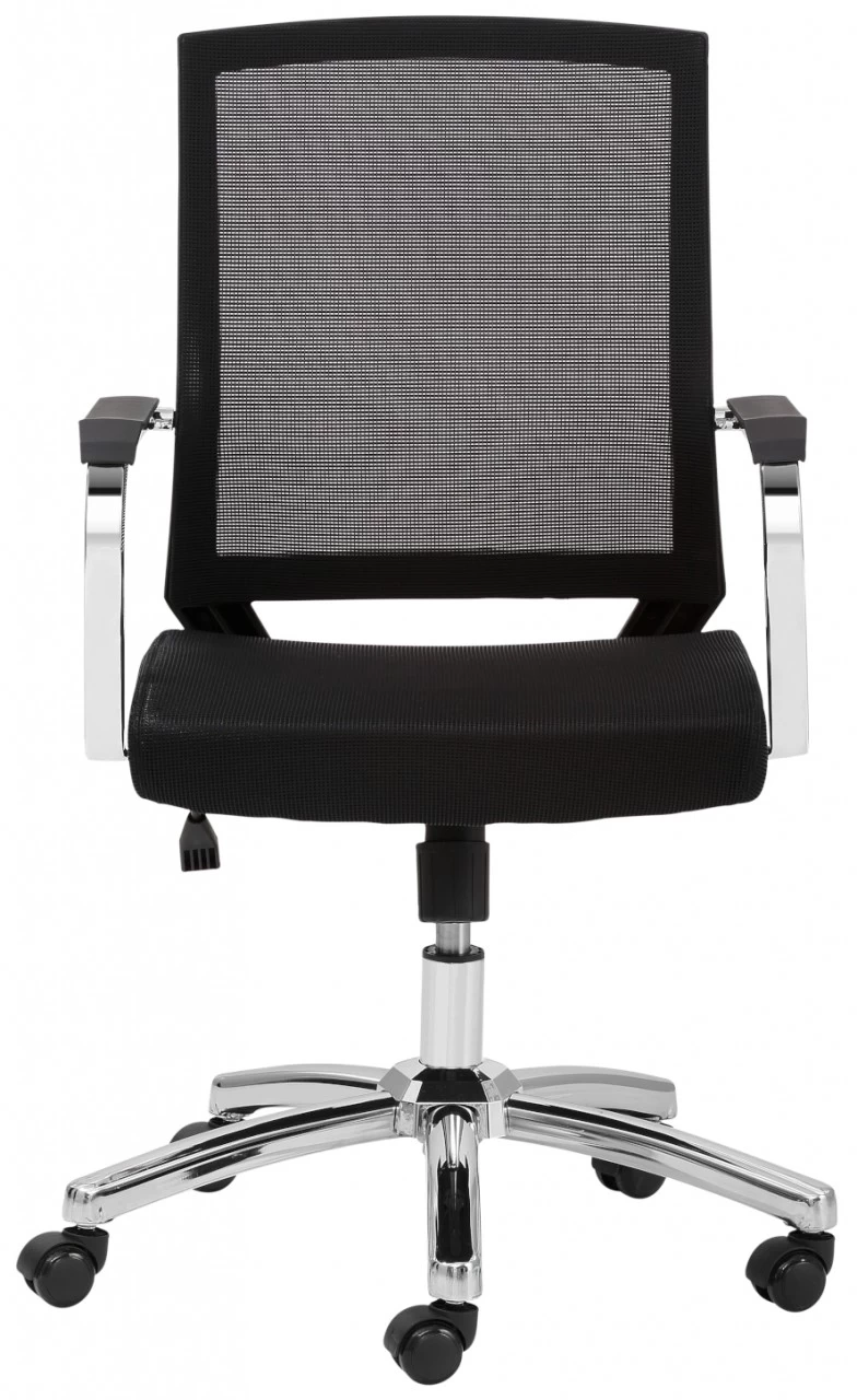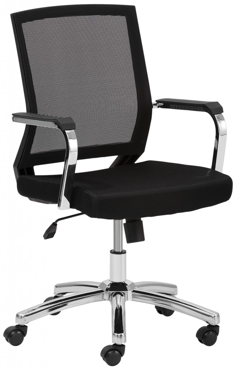 Gestell Metall verchromt, Sitz geolstert schwarz, NEtzrücken schwarz, Wippmechanik mit individueller Gewichtseinstellung, Metall-Fußkreuz verchromt, Gasfeder SGS-qualitätsgeprüft, inkl. Universal-Rollen, auch für Hartböden geeignet, feste Armauflagen Kunststoff