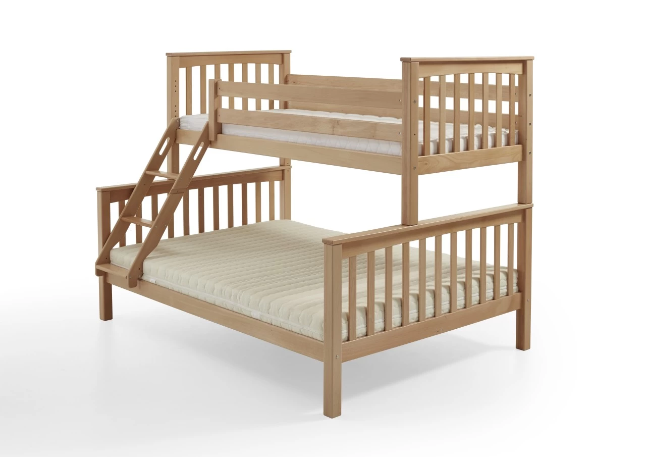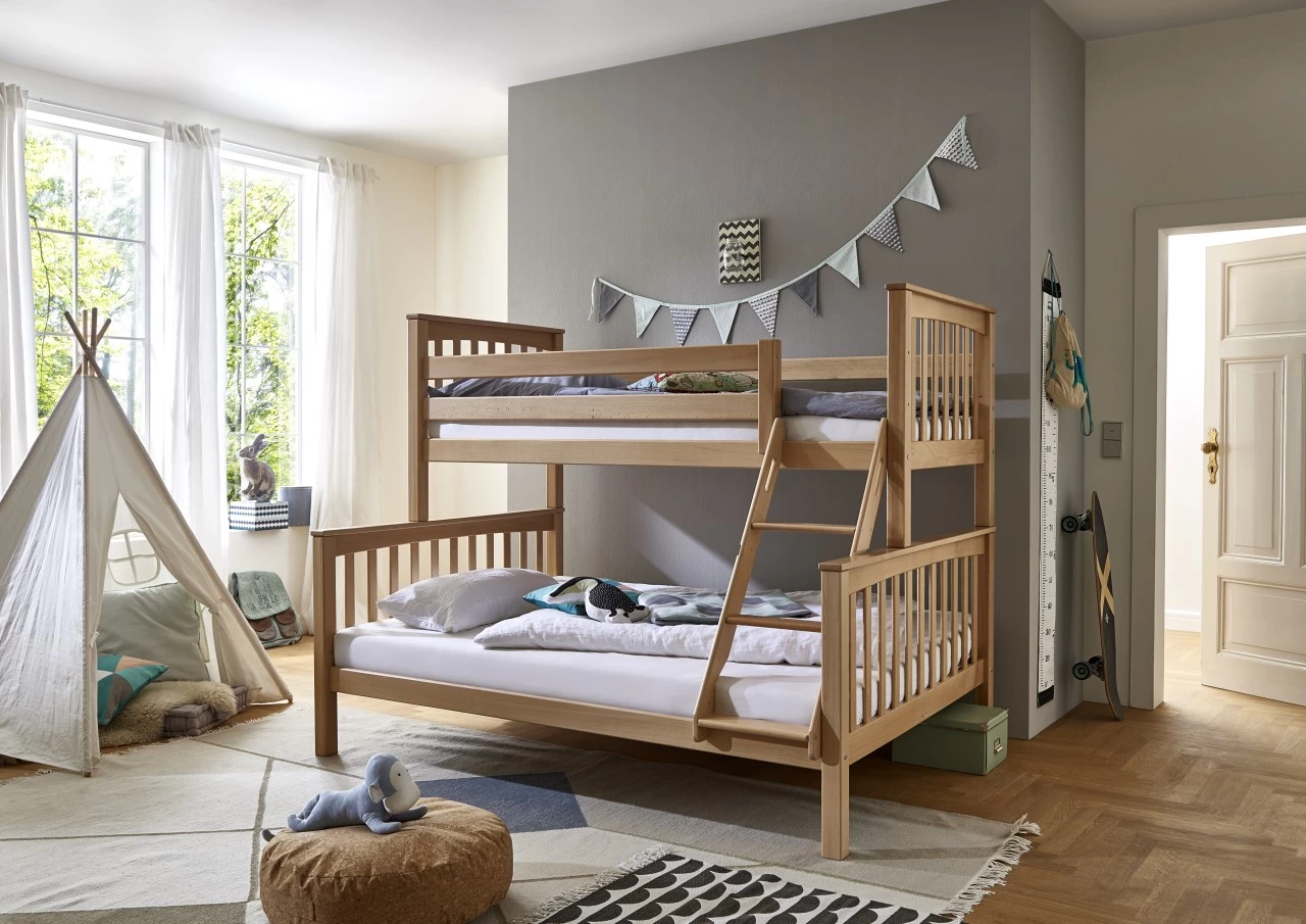Ein Tolles Etagenbett mit zwei unterschiedlich großen Liegeflächen, aus massiver Buche in Ausführung natur oder weiß lackiert.