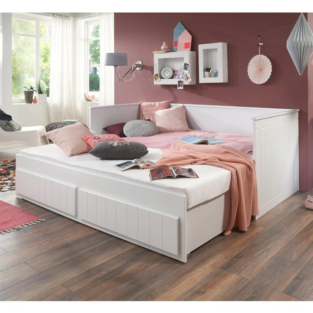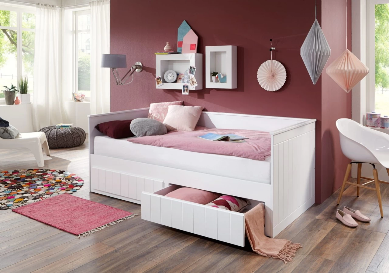 Das praktische Funktionsbett Timmi hat die Einzelbett und Doppelbett-Funktion in einem. Die normale Liegefläche ist im Maß 90×200 cm. Durch ausziehen des Unterbaus erweitert sich diese auf 180 x 200 cm und kann als Doppelbett genutzt werden. Zudem hat das Bett zwei geräumige Schubladen, die zusätzlich Stauraum bieten. Das Schubladen Innenmaß ist ca. B: 78 H: 10 T: 45 cm. Der Korpus und die Fronten bestehen aus hochwertigem MDF in weiß lackiert. Das Kopf- und Fußteil sowie die Schubladenfronten haben außen ein Rillenprofil. Das Bett ist komplett ausgestattet da die Rollroste bereits im Lieferumfang inbegriffen sind. Die Einlegetiefe der Matratze beträgt ca. 12 cm. Sie können auch zwei Matratzen übereinander legen, da die Seiten und das Rückenteil so hoch ist, das man noch bequem sitzen kann. Sie brauchen dann die zweite Matratzen nur nach vorne zu klappen und das Bett mit 180x 200 cm Liegefläche ist fertig. Die Matratzen und die Deko gehören nicht zum Lieferumfang. Die Beschläge sind aus Metall.