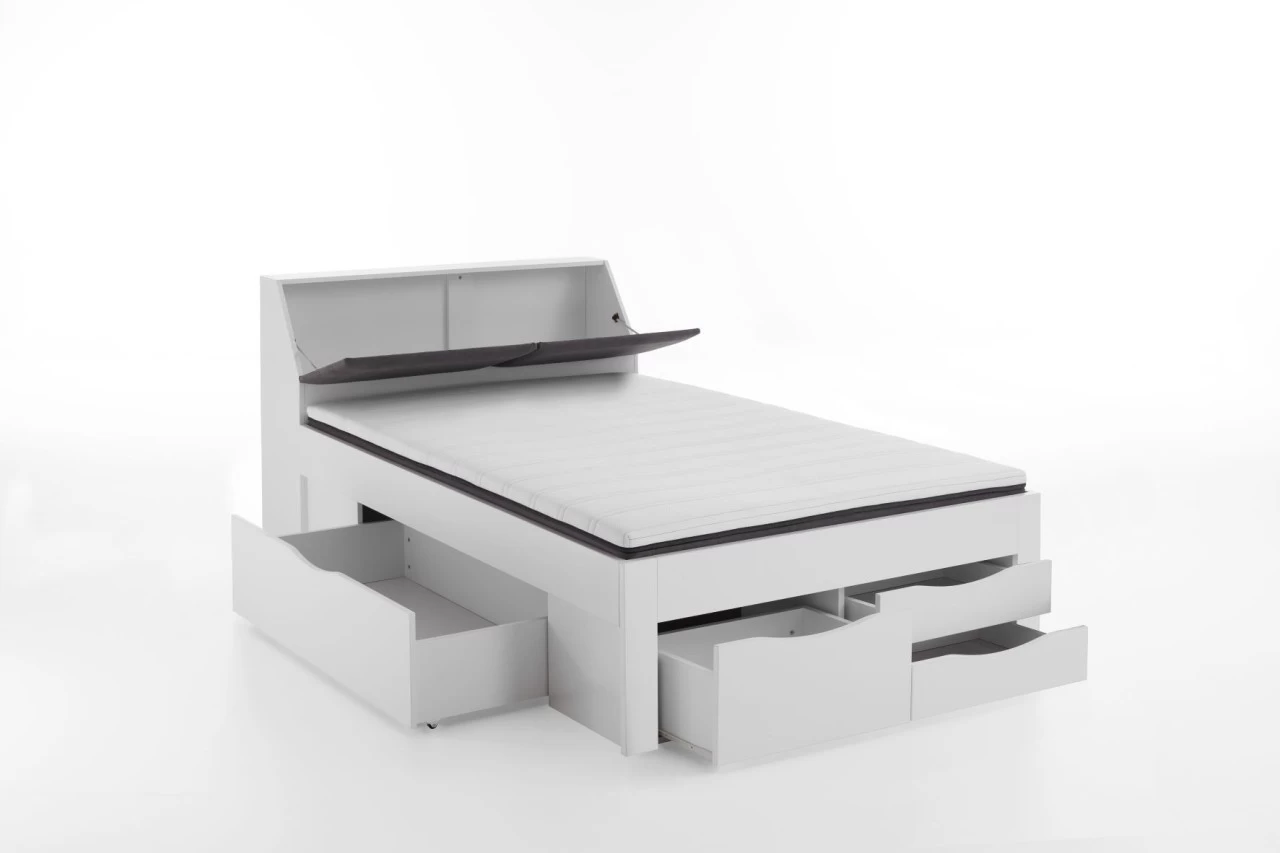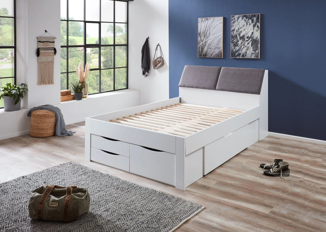 Funktionsbett Maxi mit Liegefläche 140 cm x 200 cm, mit Rolllattenrost, Bettschubladen und Stauraum-Polster-Kopfteil. Das Trägermaterial ist 18 mm Spanplatte und hat eine pflegeleichte Oberfläche in Dekor Weiß. Dieses Bett verbindet Komfort und Stauraum miteinander. Die Blenden der Posterkopfteile (ca. 40 cm hoch) sind zum Klappen, wodurch der Zugang zum Stauraum im Kopfteil ermöglicht wird. Hier kann man Bettwäsche oder andere Dinge gut unterbringen. Die Polsterung der Kopfteilblenden ist aus 100 % Polyester, nicht abnehmbar, nicht waschbar. Sie bieten optisch einen guten Absatz zum weißen Dekor. Das Bett hat eine Seitenhöhe vom Boden bis Oberkante der Bettseite von ca. 55,8 cm. Bei dieser Komfort-Liegehöhe fällt der Einstieg ins Bett leicht. Generell ist der Mittelsteg im Lieferumfang enthalten. Unter dem Bett befinden sich Schubladen, die dir viel Stauraum bieten.
