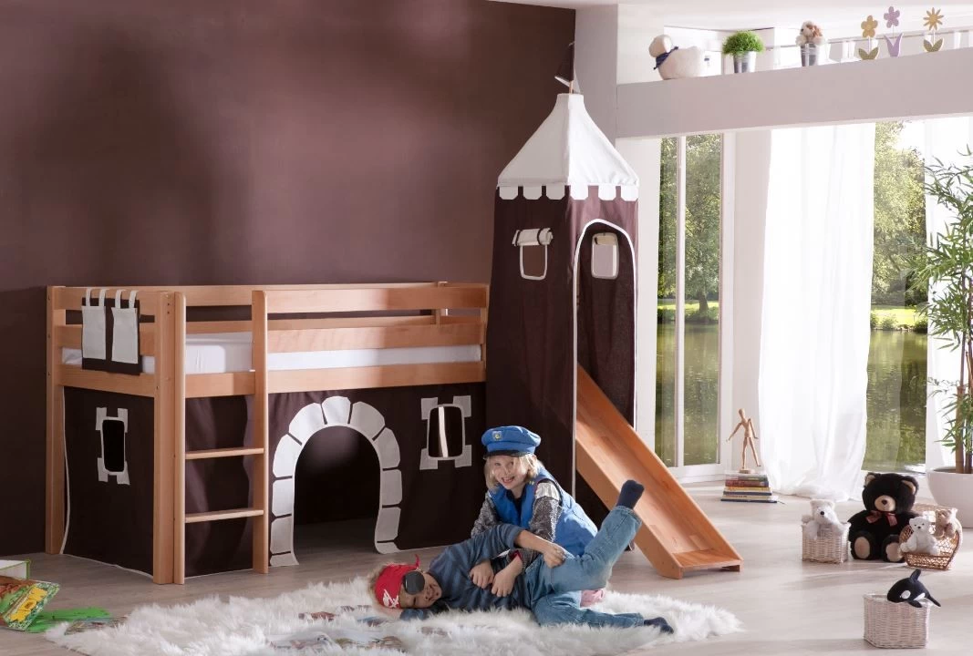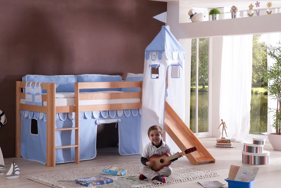 Kleine Bewohner sind sicher aufgehoben, da eine Bettumrandung vor dem Herunterfallen schützt. Erreichbar mit einer eingelassenen Leiter, die links oder rechts beliebig verbaut werden kann, wird das Hochbett mit der Liegefläche 90x200cm zum eigenen kleinen Reich. Das Bett zeichnet sich durch hochwertige Verarbeitung, sehr gute Qualität und Stabilität aus. Ein sehr Schönes Bett zum Schlafen und Spielen.