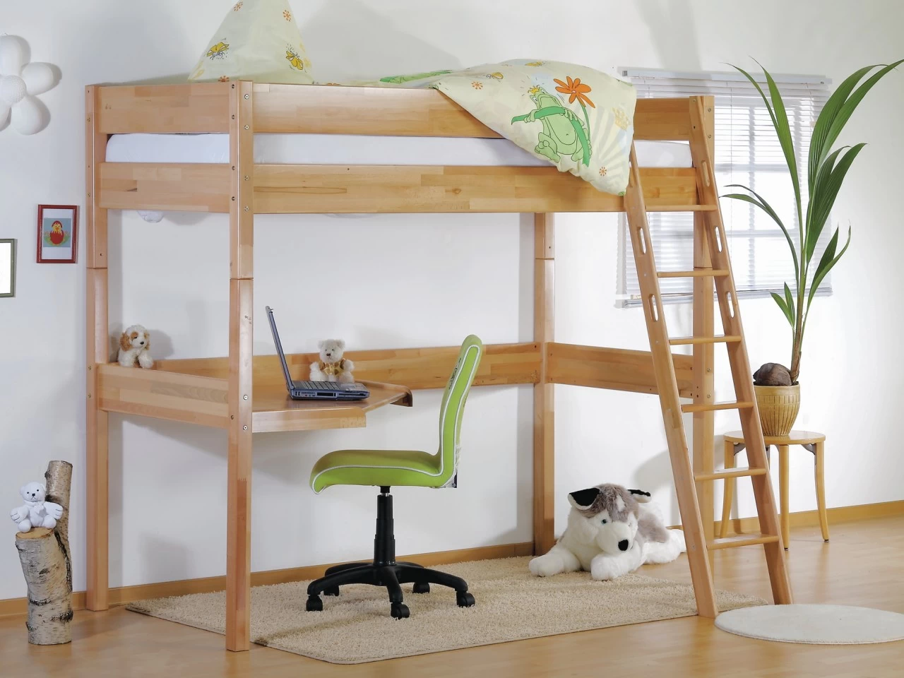 Ein tolles Hochbett mit 90 x 200 cm Liegefläche. Ideal für das Kinderzimmer. Durch die hohe Bauweise kann der Raum unter dem Bett (ca. 145 cm hoch) noch gut genutzt werden. Das gesamte Bett ist aus massiver Buche in der Ausführung natur oder weiß lackiert. Durch die Stabverleimung entsteht eine geplankte Optik. Auch der Lattenrost ist bereits im Lieferumfang mit enthalten. Die Stellfäche/Arbeitsplatte ist B: 90 x H: 75 x T: 90 cm. Die Leiter ist links wie rechts montierbar. Ein umlaufender hoher Absturzschutz bietet zusätzlich Sicherheit. Die breiten Trittstufen, der Leiter, sorgen für sicheres Hinauf- und Herabsteigen. Zusätzlich haben die Seiten der Leiter Grifflöcher, die zusätzlichen Halt und Sicherheit geben. Die hochwertige Verarbeitung zeichnet das Bett aus. Bei Bedarf kann es später auch zu einem Einzelbett mit 90×200 cm Liegefläche umgebaut werden, da die Bettpfosten geteilt sind. Die Pfostenstärke ist ca. 6,0 x 6,0 cm. Der Artikel ist zerlegt zur einfachen Selbstmontage. Eine Wandbefestigung des Bettes muss erfolgen. Stellfläche ca. Stellfläche ca. B 207 x T 98 x H 185 cm.