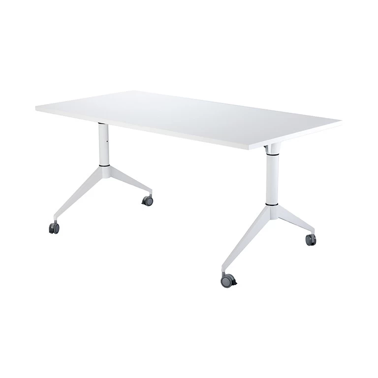 Klapptischprogramm für den Innenbereich. Füße aus Aluminium mit Polyurethanrädern mit Bremse. Säulen aus stranggepresstem Aluminium und Stützstange aus Stahl. Weiße Struktur und weiße Tischplatte aus Melamin, 25 mm stark, mit einem Griff, der den Flip-Tisch-Mechanismus antreibt. An der Seite Verknüpfungsmöglichkeiten , was es ermöglicht, mehrere Tische als kompakte und stabile Struktur zu verbinden.