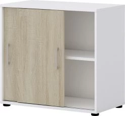 Der niedrige Aktenschrank hat zwei Schiebetüren mit zwei dahinter liegenden Regalfächern in Ordnerhöhe, bzw. -tiefe.