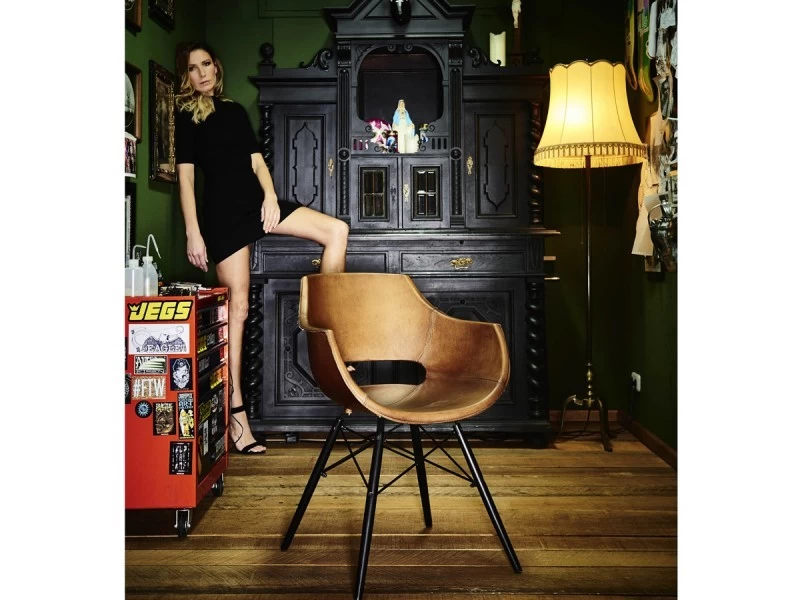 Die Sitzschale ist rundum komplett mit Leder bezogen in Camel Antik matt braun.
